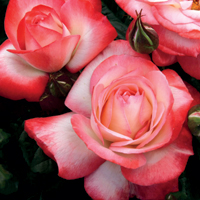 High centered, spiraled blossoms suffused with coral and cream. Broad petals show a hing of ruffle. 1986 AARS Award Winner.